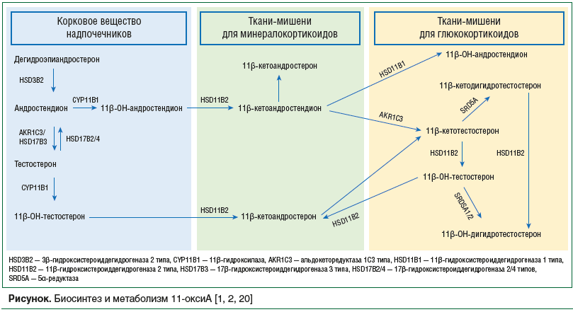 В коре надпочечников 11-оксиА синтезируются по Δ5-пути, в котором прегненолон превращается в DHEA, затем часть DHEA конвертируется в андростендион. 11β-гидроксилаза (CYP11B1) катализирует продукцию 11β-ОН-андростендиона из андростендиона. Наибольшее количество биологически активных 11β-кетотестостерона и 11β-кетодигидротестотерона синтезируется интракринно в периферических тканях: после поступления в клетку из системного кровотока прекурсор превращается в активный андроген и связывается с АР. Каждая клетка определяет количество активного гормона, продуцируемого внутриклеточно с помощью определенного набора ферментов. После завершения биологического действия стероид инактивируется и выводится из клетки. Необходимо отметить, что метаболиты 11-оксиА могут быть вновь превращены в агонисты АР [20].